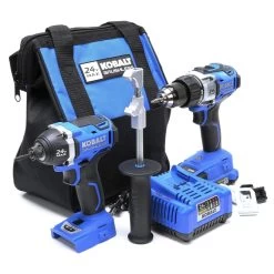 - Kobalt 24-volt cordless combo kit includes 1/2-in brushless drill/driver, 1/4-in brushless impact driver, 2.0Ah battery and charger