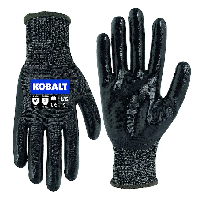 These black Kobalt gloves with nitrile palms and fingertips are cut resistant. HPPE (High Performance Polyethylene) shell and knit wrist cuff to keep out dirt and debris.