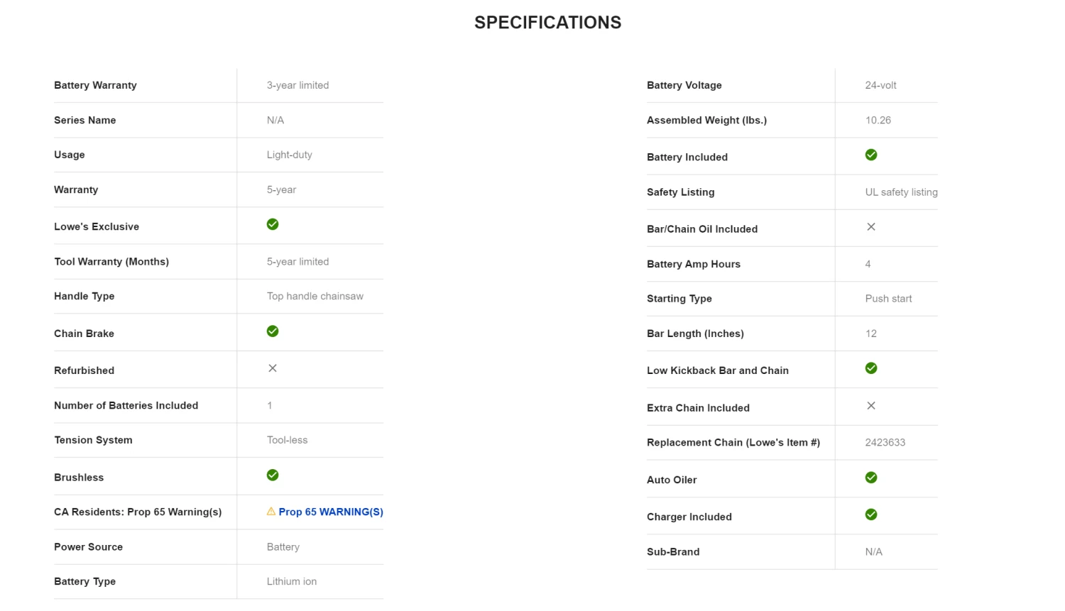 The Kobalt 24-Volt Brushless 12in chainsaw provides you with the power to complete most yard tasks!