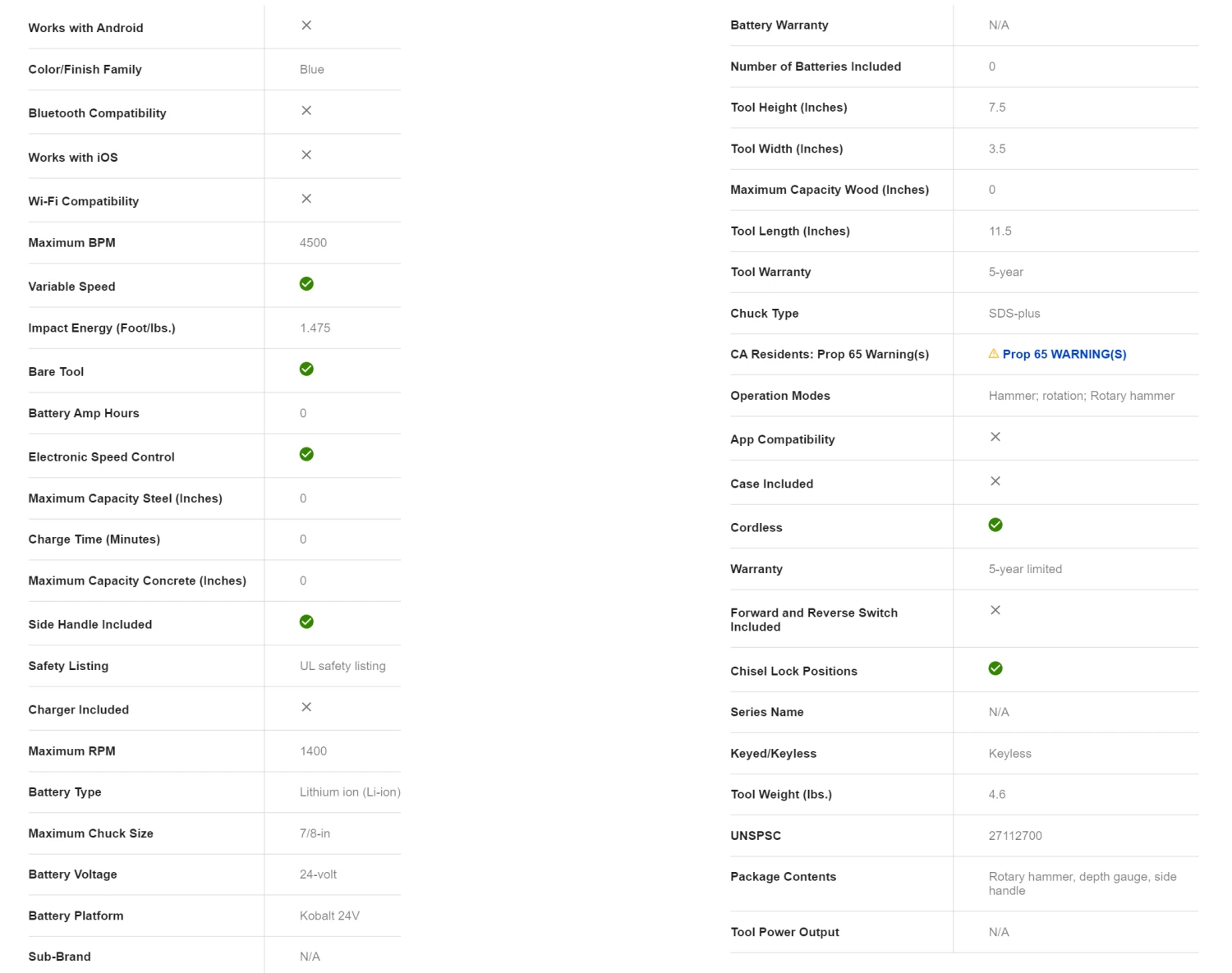 The Kobalt 24-Volt Brushless Rotary Hammer provides 0-1,400 RPM and 0-4,500 BPM, power to get through various materials.